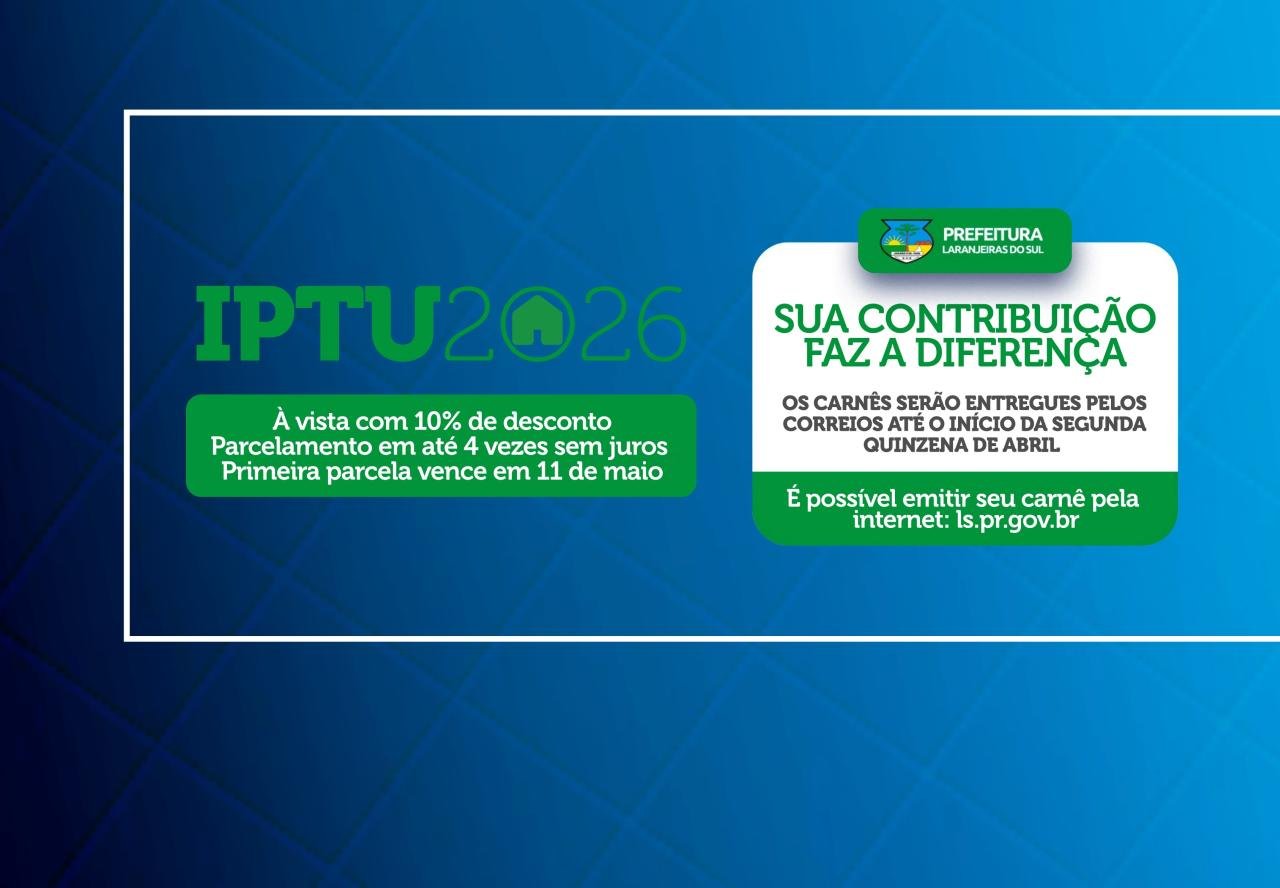 A Prefeitura de Laranjeiras do Sul iniciou a campanha do Imposto Predial e Territorial Urbano, o IPTU 2026. Os carnês serão entregues pelos Correios até o início da segunda quinzena de abril, e quem preferir pode emitir a guia diretamente pelo site oficial do município.