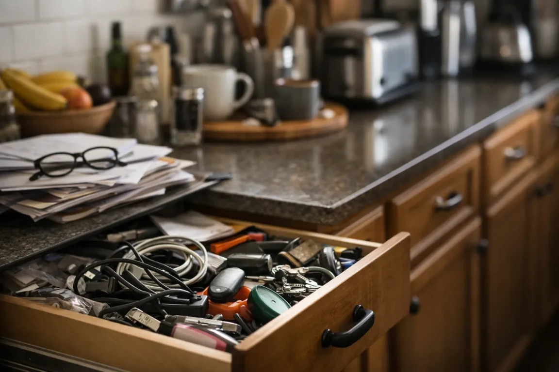 Mesmo após uma faxina completa, a bancada da cozinha pode continuar transmitindo sensação de desordem. O acúmulo visual, mesmo quando tudo está limpo, cria exaustão visual constante.