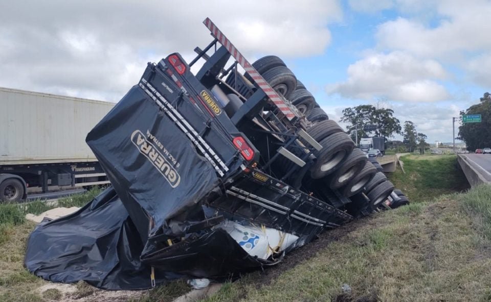 Uma carreta transportando adubo tombou neste domingo (22) no viaduto entre o Contorno Sul e a Rodovia do Xisto, na região da Cidade Industrial. O acidente ocorreu após o motorista fazer uma manobra para evitar colisão com outro veículo na BR-277, no sentido Paranaguá-Curitiba.