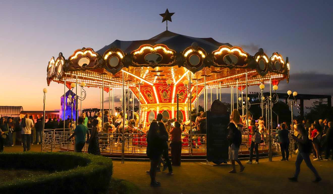 Durante o dia e à noite, o carrossel oferece passeios gratuitos para crianças de até 12 anos. Adultos podem acompanhar crianças de 0 a 2 anos.