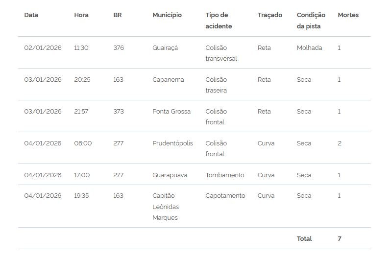 A Operação Ano Novo 2026, que ocorreu entre terça-feira (30/12) e domingo (4/1), registrou 107 acidentes nas rodovias federais do Paraná, resultando em 121 feridos e sete mortes, Os sinistros concentraram-se nos dias de maior fluxo, principalmente quinta-feira e fim de semana.
