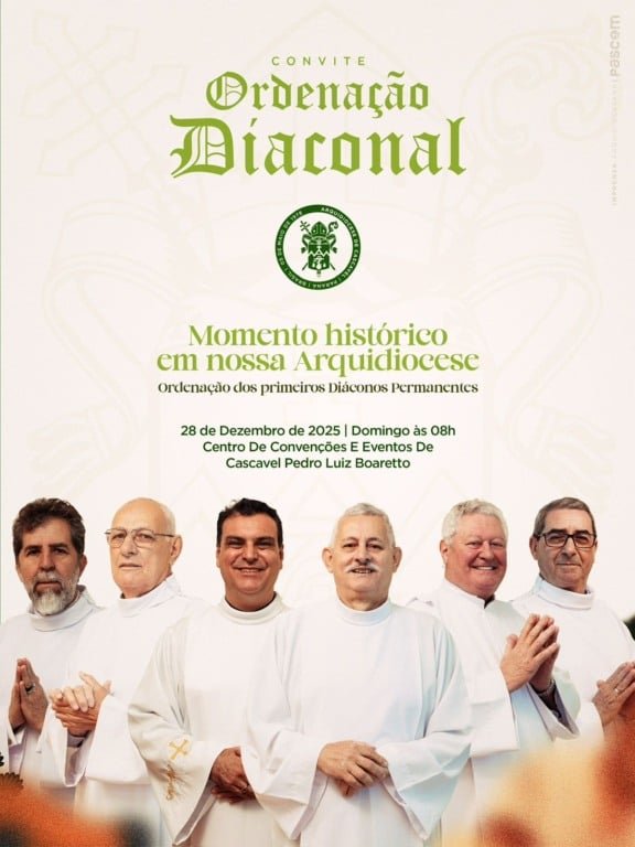 O encerramento também contará com a ordenação dos primeiros diáconos permanentes da Arquidiocese de Cascavel, um marco inédito e de grande significado pastoral.