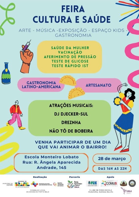 No dia 28 de março, a Escola Monteiro Lobato, localizada na Rua Ângela Aparecida de Andrade, 145, no bairro do Porto Belo, em Foz do Iguaçu, receberá a Feira Cultura e Saúde. Esta iniciativa é promovida pelo Conselho Local de Saúde do Porto Belo, em colaboração com a Feira Agroecológica e Cultural, e conta com o apoio de diversas instituições, incluindo a Pró-Reitoria de Extensão da UNILA e a Secretaria Municipal de Saúde.