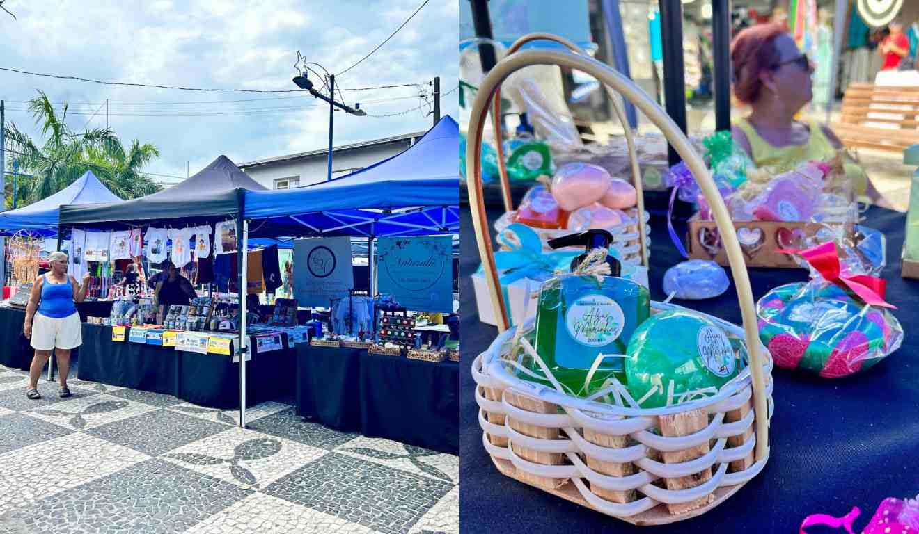A Feira Livre de Matinhos, localizada no calçadão do centro do município, oferece diversas opções de compra por apenas R$ 30,00, incluindo peças de artesanato, acessórios, sabonetes artesanais e lembranças personalizadas.