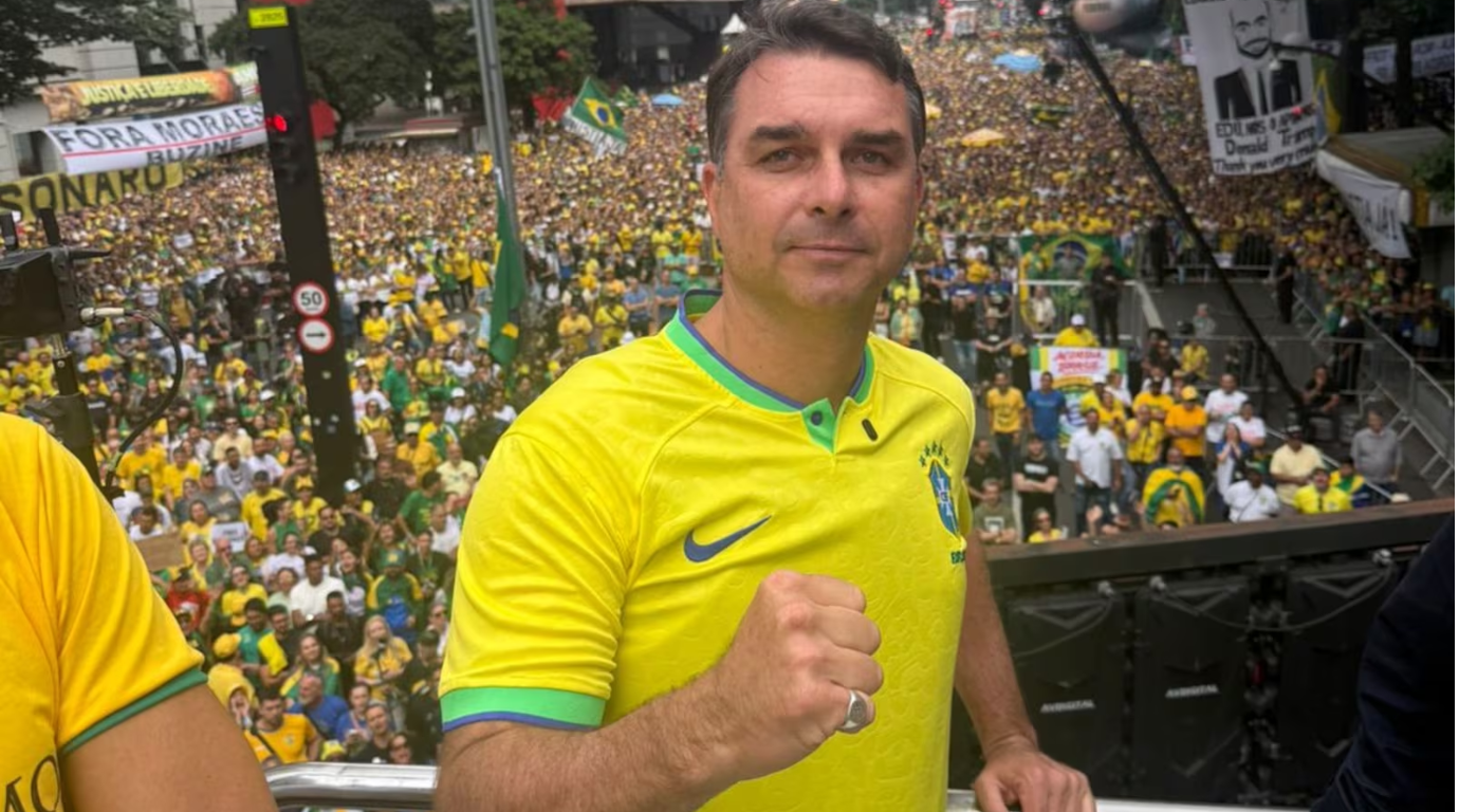 O colete estava por baixo de uma camisa da Seleção Brasileira. Flávio chegou à Avenida Paulista acompanhado de figuras como o deputado federal Nikolas Ferreira, o governador Romeu Zema e o pastor Silas Malafaia. No entanto, ele enfrentou dificuldades para se deslocar até o carro de som, sendo auxiliado por seguranças e aliados.