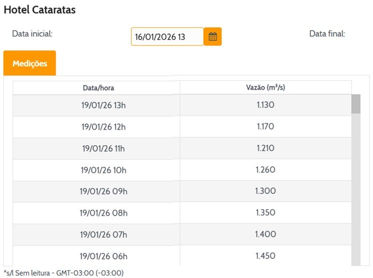 Vazão das Cataratas do Iguaçu: às 13 h desta segunda-feira, a vazão de água nas Cataratas do Iguaçu era de 1.130 m³/s, cerca de 25 % abaixo do referencial de 1.500 m³/s para o trecho do rio em Foz do Iguaçu. Para as próximas horas, a Companhia Paranaense de Energia (Copel) indica tendência de redução.