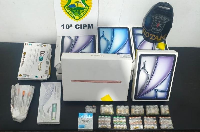 Procedida a abordagem, foram identificados os ocupantes do veículo e realizada revista pessoal. Durante a conferência das bagagens, foram localizados 10 tablets, 1 notebook, 15 unidades de anabolizantes e 44 unidades de medicamento de uso controlado.