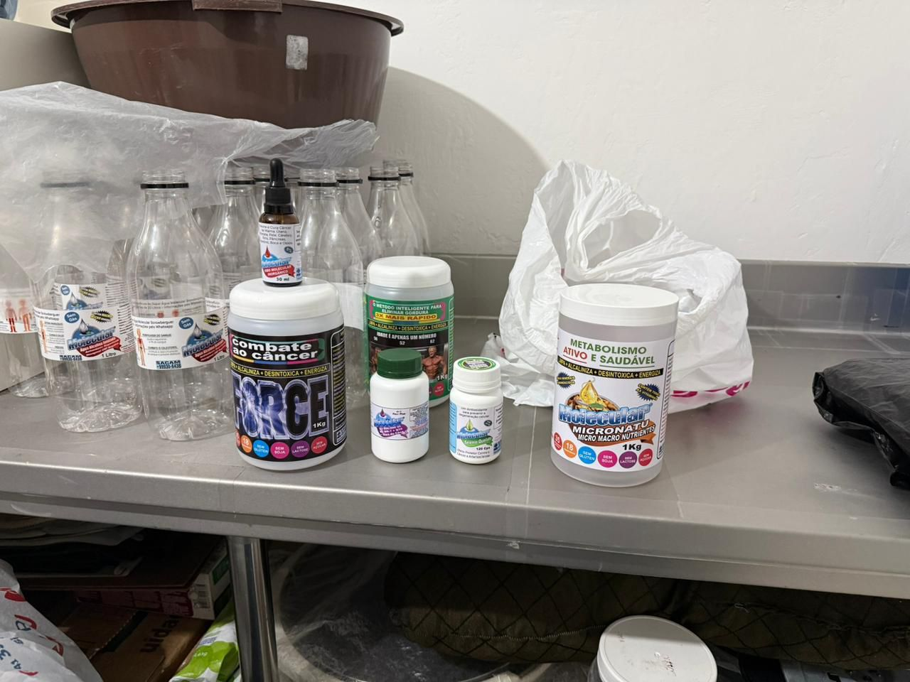 Entre os produtos encontrados estavam uma água chamada “molecular”, além de azeite, sabonete, sal, amaciante de roupa e sabão de roupa. Os itens eram divulgados como “moleculares” e apresentados como soluções para enfermidades.