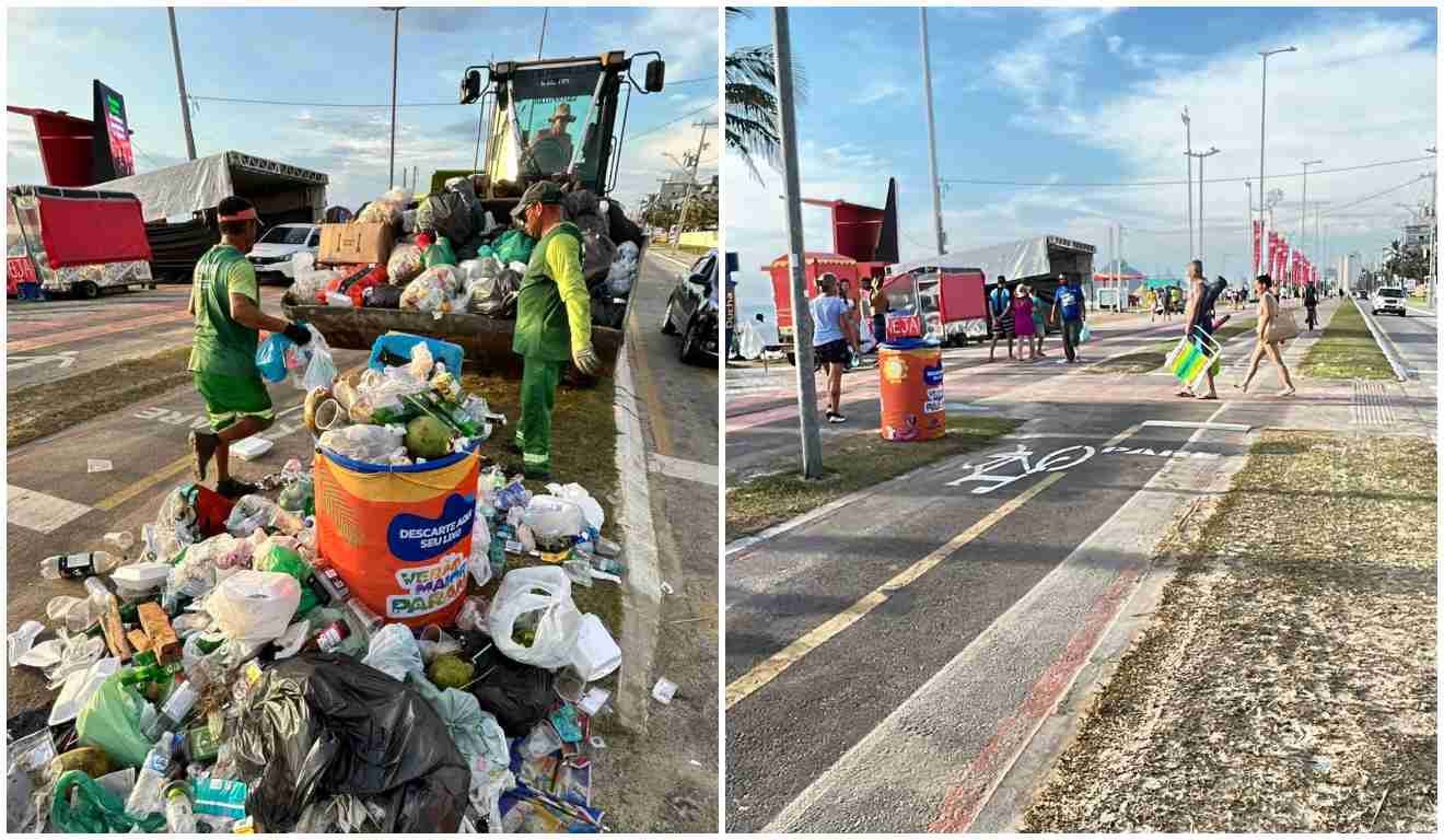 Além da orla, a prefeitura contabiliza grandes volumes de lixo retirados de outras regiões da cidade, incluindo resíduos orgânicos, elevando o total diário. A equipe varre a areia, removendo coco, garrafas, latinhas e plástico, e concentra pontos de sujeira no calçadão.