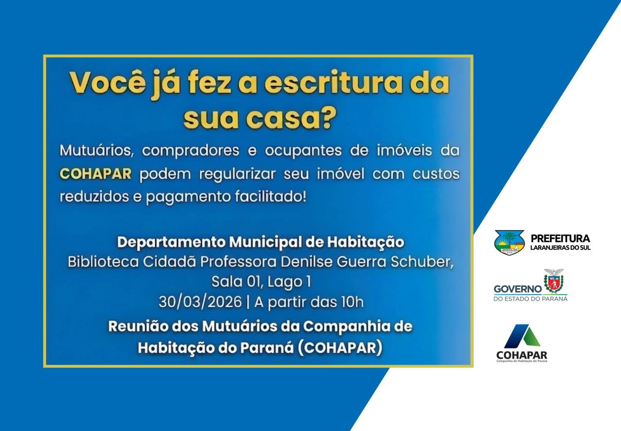 A Companhia de Habitação do Paraná (COHAPAR) estará em Laranjeiras do Sul no dia 30 de março de 2026, oferecendo atendimento aos mutuários que necessitam regularizar a escritura de seus imóveis. O serviço será realizado na Biblioteca Cidadã Professora Denilse Guerra Schuber, Sala 01, no Lago 1, onde está localizado o Departamento Municipal de Habitação. As horas de atendimento estão agendadas para das 10h às 12h e das 13h às 15h.