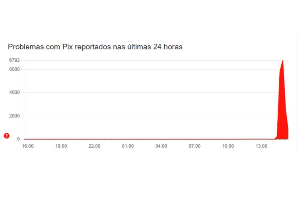 o pico de reclamações sobre o Pix fora do ar ocorreu por volta das 14h40, acumulando mais de seis mil notificações em poucos minutos.