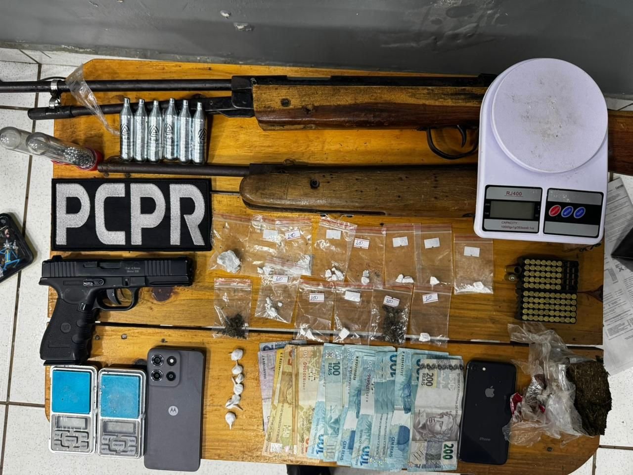 A operação teve início com o cumprimento de mandado em um edifício no Centro, onde foram apreendidas porções de cocaína e maconha prontas para venda, um tablete de maconha, balanças de precisão, simulacros de armas de fogo, munições e dinheiro em espécie.