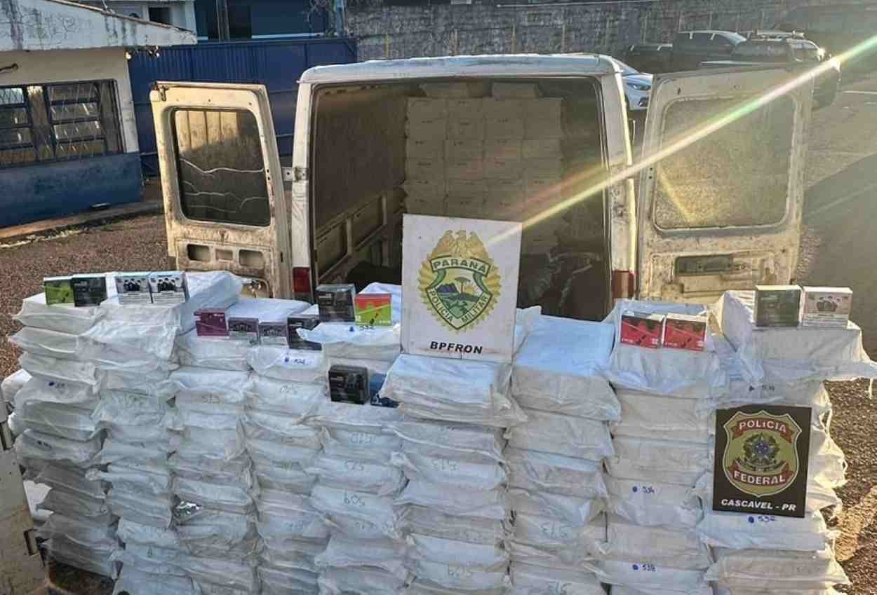 Uma operação conjunta entre o Batalhão de Polícia de Fronteira (BPFron) e a Polícia Federal (PF) resultou na apreensão de 13.560 cigarros eletrônicos durante fiscalização na BR-277, no Paraná. A mercadoria ilegal, ocultada sob sacos de carvão, foi detectada ao parar uma van em Cascavel por excesso de velocidade.