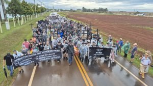 Além disso, a ação representa os 36 produtores rurais que tiraram a própria vida, em razão do endividamento no campo. A mobilização começou nas primeiras horas do dia, a partir das 6h30. Os manifestantes percorreram cerca de seis quilômetros até o parque da feira, às margens da RS-142, onde ocorre o evento.