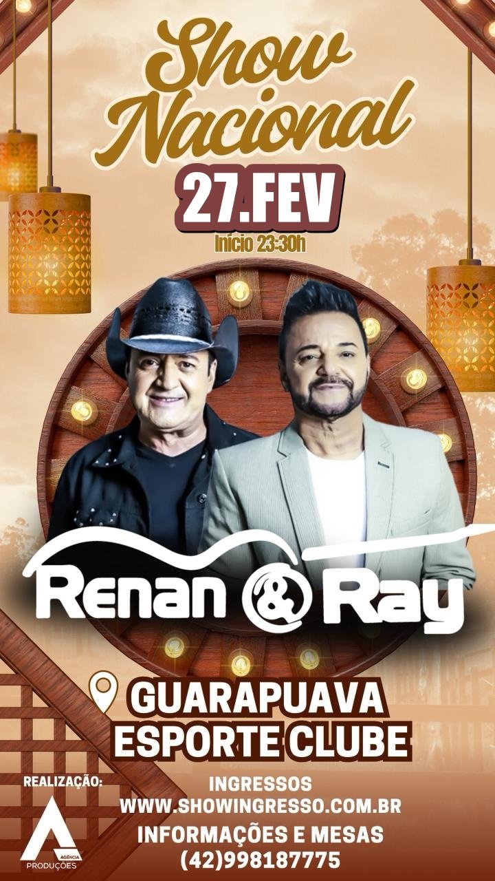 A cidade de Guarapuava será palco de um evento marcante no dia 27 de fevereiro, quando a dupla Renan & Ray realizará um show nacional para o lançamento de seu novo DVD. Conhecida como "a dupla mais apaixonada do Brasil", Renan & Ray prometem emocionar os fãs e transformar o Guarapuava Esporte Clube em um espetáculo repleto de romantismo.