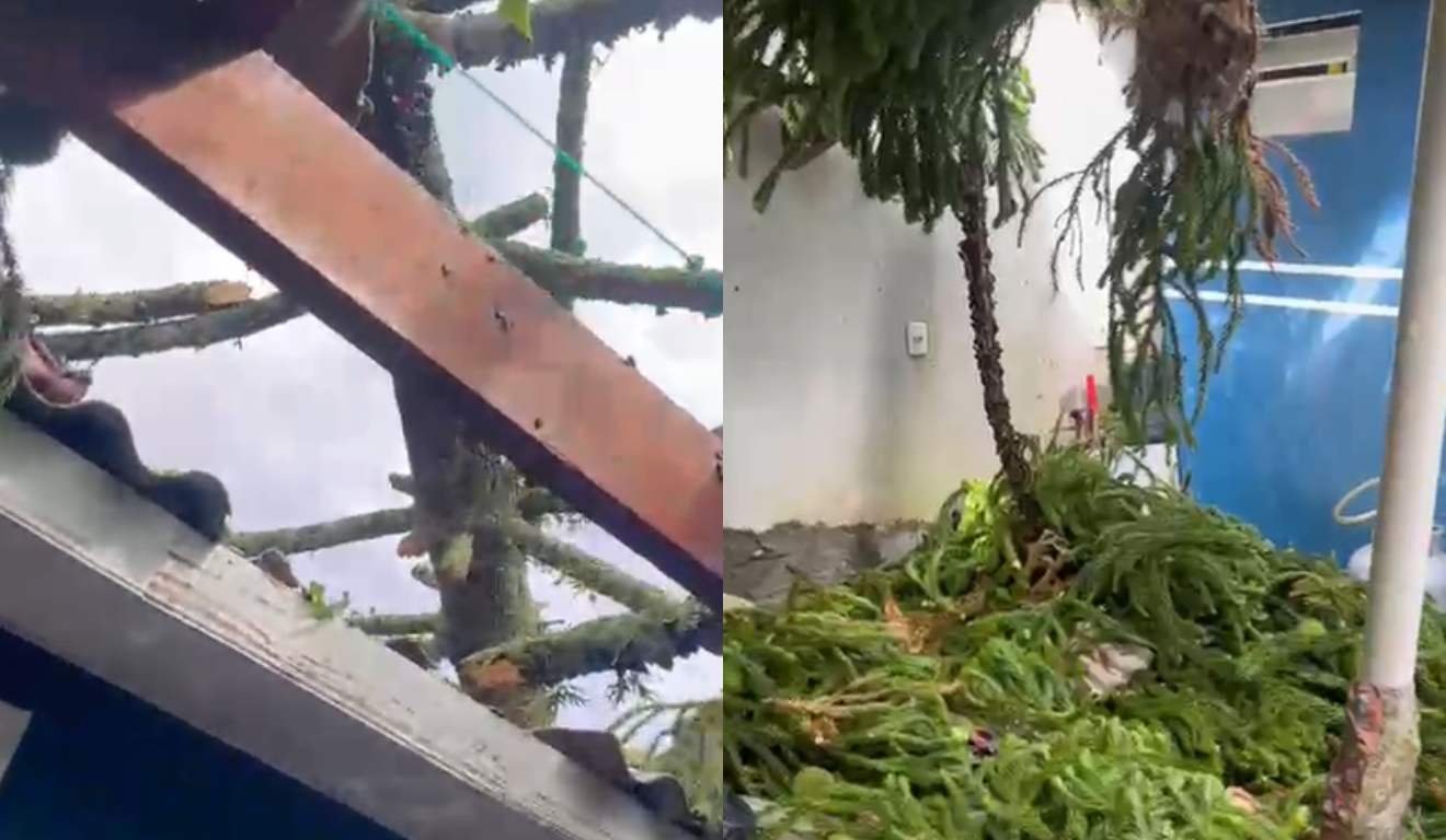 Um vídeo, gravado pelo morador, mostra o telhado desabado e a árvore dentro da casa. O Sistema de Tecnologia e Monitoramento Ambiental do Paraná (Simepar) registrou 5 mm de chuva acumulada em Pinhais.